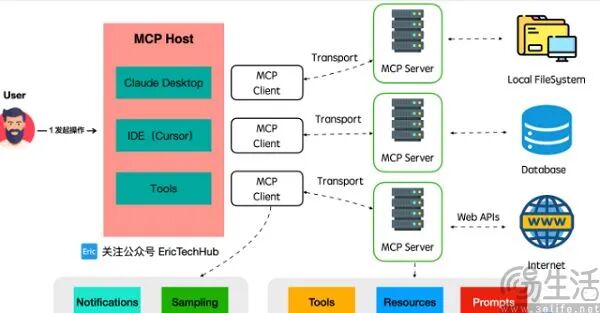 有鉴于此,Anthropic就设计了MCP(Model Context Protocol),旨在通过标准化接口实现大语言模型(LLM)与外部数据源及工具的无缝集成。MCP就像AI应用的USB-C接口,通过能力协商、能力发现、订阅/通知等一系列工作,让AI模型知道有哪些工具、哪些数据是可用的,以及如何使用这些资源。