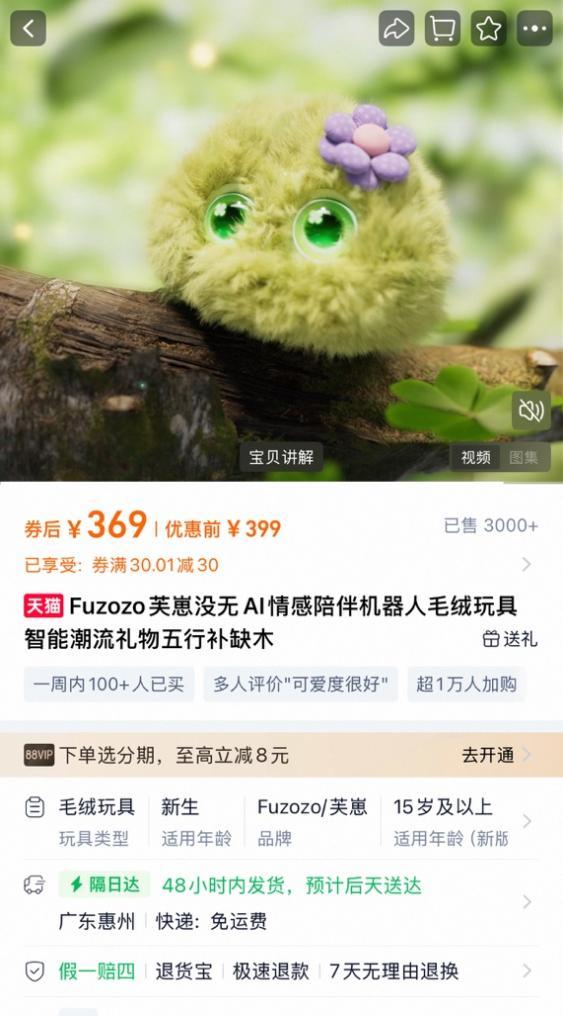 从去年8月开售到现在,「BubblePal」已卖出将近30万台。电商平台上,每件日常价格在350-400元间浮动,总销售额超过1亿元。在全球AI玩具总销量尚不超过100万台的当下,稳居全球销量榜首。