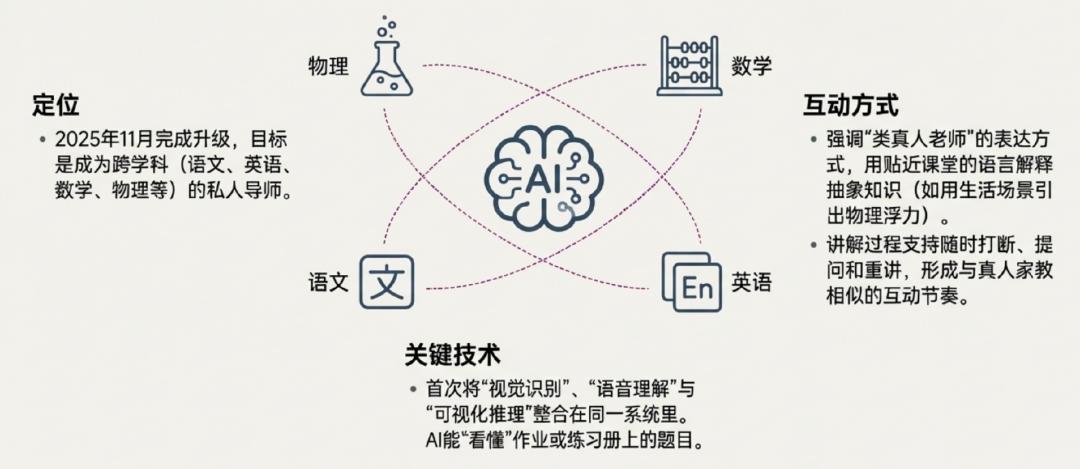 国内的小猿 AI 超拟人老师在 2025 年 11 月完成了新一轮升级,将「过程化讲解」扩展到语文、英语、数学、物理等,形成跨学科讲解。