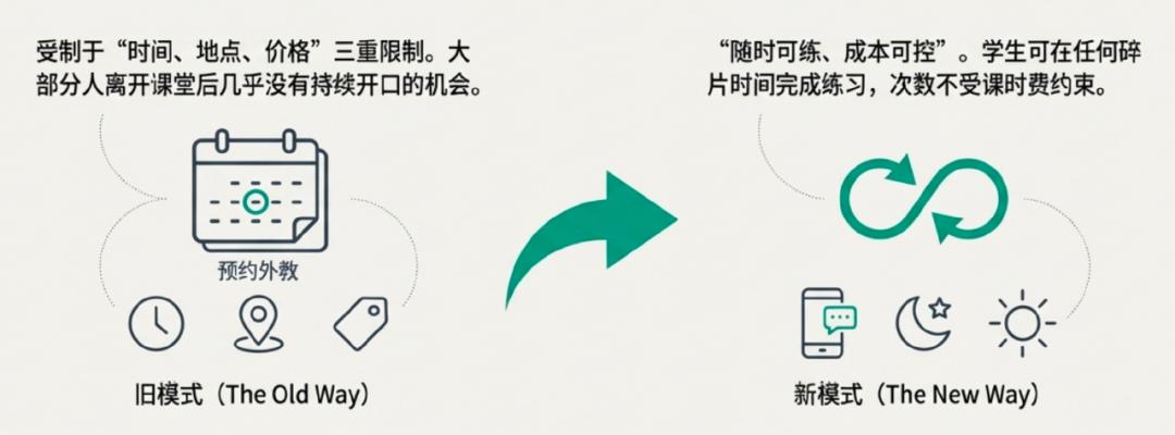 从学习体验来看,AI 语言陪练带来的变化,不只是多了一个功能入口,而是把练习这件事本身的条件改写了。过去,想进行真实对话练习,往往需要预约外教、上小班课,受时间、地点和价格的多重限制;一旦离开课堂,大部分人几乎没有持续开口的机会。