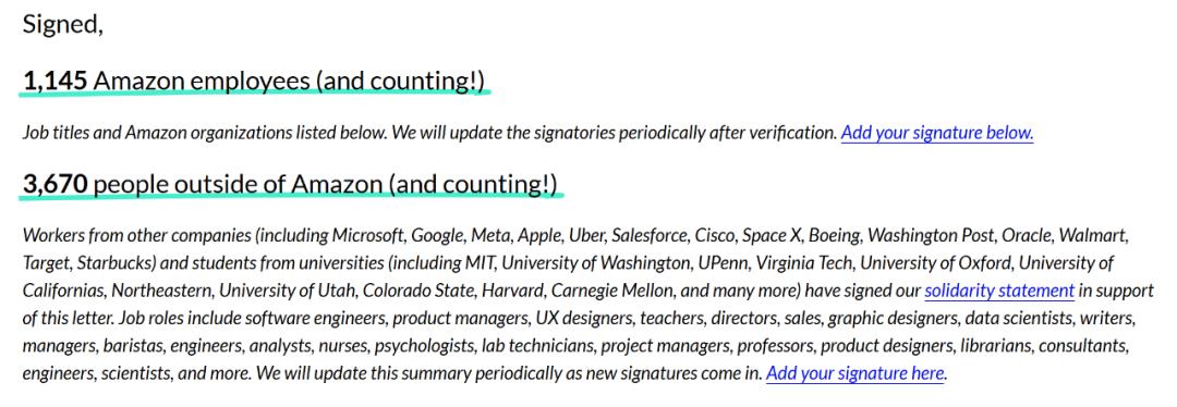 然而,从这封公开信的签名人数来看,人们对亚马逊的这番回应似乎并不买账:截至发稿,亚马逊员工签名人数已达 1145 人,非亚马逊员工(外部人士)的签名数也已达到 3670 人,且均在持续增加。