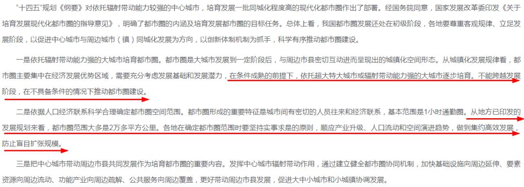 这段话,拆开来看,就两个关键: 第一,都市圈主要集中在经济发展优势区域,需要充分考虑发展基础和发展潜力,在条件成熟的前提下,依托超大特大城市或辐射带动能力强的大城市逐步培育。