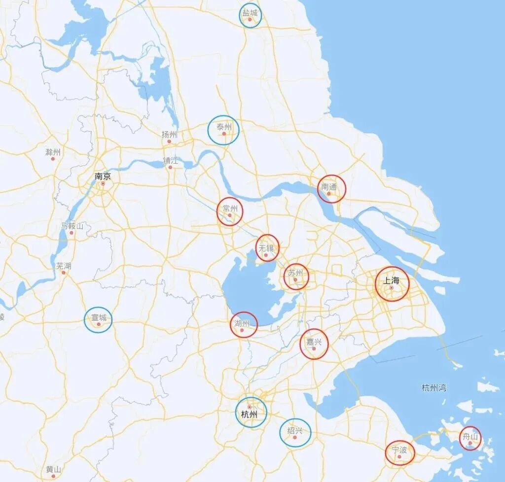 自2019年安徽全境加入长三角大家族后,长三角城市圈涵盖三省一市,覆盖41个城市,坐拥上海、苏州、杭州、南京、宁波、无锡、合肥、南通、常州9个万亿城市。
