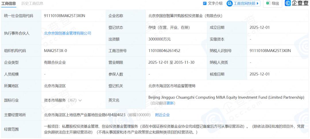投资界-解码LP获悉,近日企查查显示,注册规模300亿元人民币的“北京京国创智算并购股权投资基金(有限合伙)”在北京海淀区正式落地。