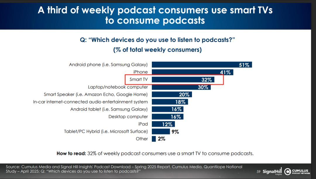 Cumulus Media and Signal Hill insights联合发布的报告显示:“三分之一每周收听播客的听众通过智能电视消费播客,仅次于智能手机,电视是重要的视频播客传播渠道。”