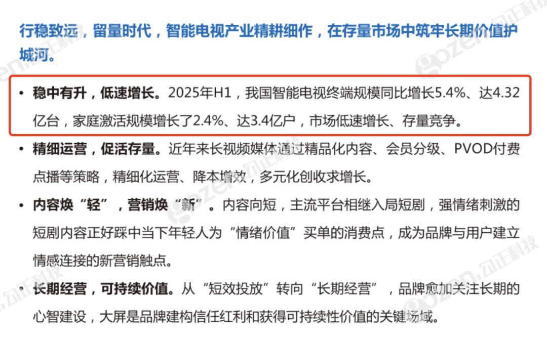 另外,从《2025H1中国家庭智能大屏行业发展白皮书》的数据来看:2025年H1,我国智能电视终端规模同比增长5.4%、达4.32亿台,家庭激活规模增长了2.4%、达3.4亿。