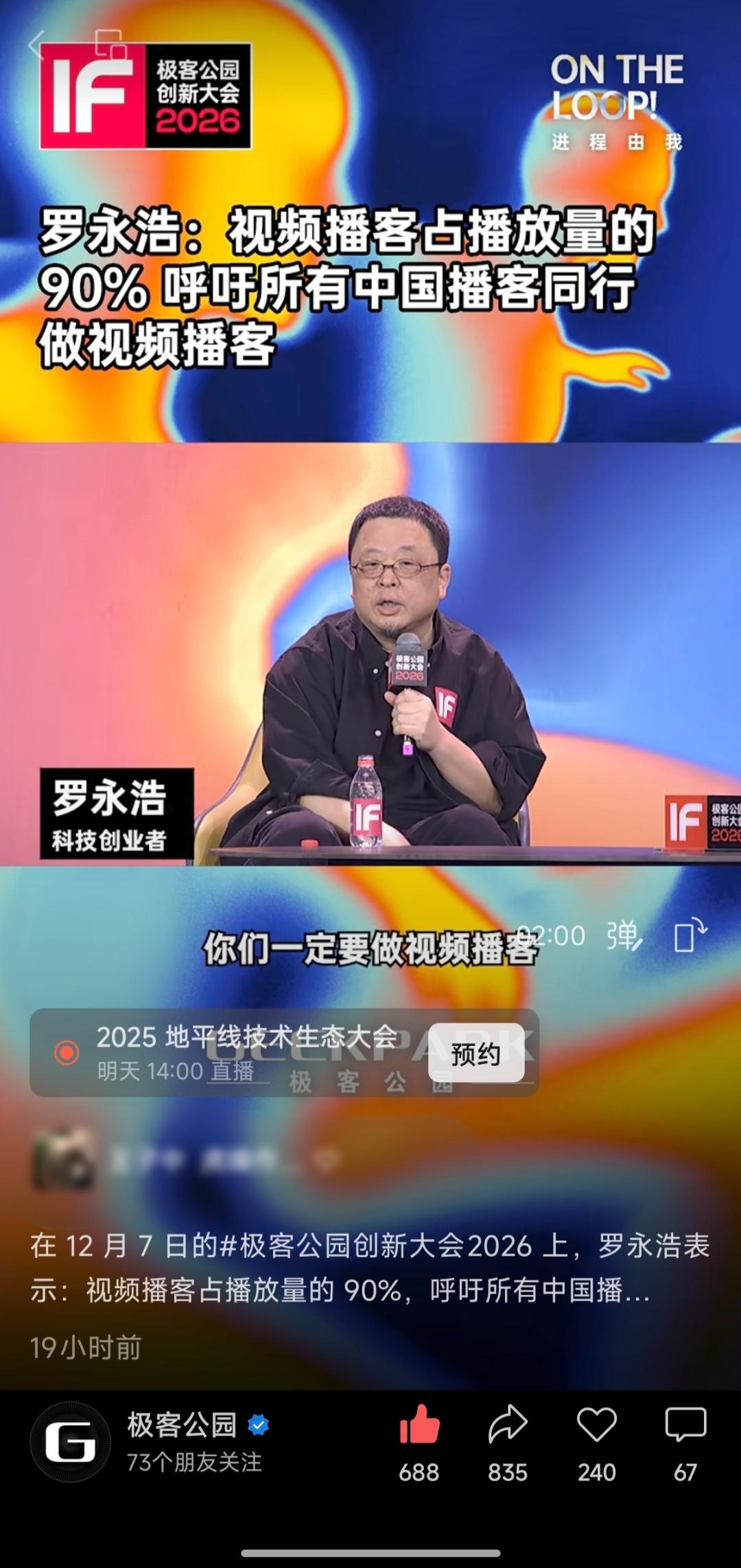 12月7日,在极客公园创新大会上,罗永浩公开呼吁播客同行要拥抱视频化:不要抱着古怪的偏执,认为播客只能是音频;自己的播客内容已上线11个平台,视频版本贡献了80%–90%的流量。(大意)