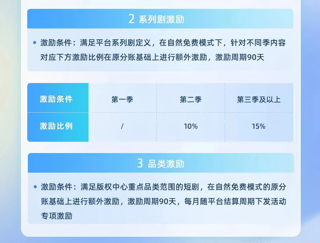 同时,对系列剧的扶持也展现出短剧版权中心对IP的长效开发,如“短剧贺新春”激励活动中,平台针对符合条件的系列剧第二季给予10%的额外激励,第三季额外激励比例达15%。