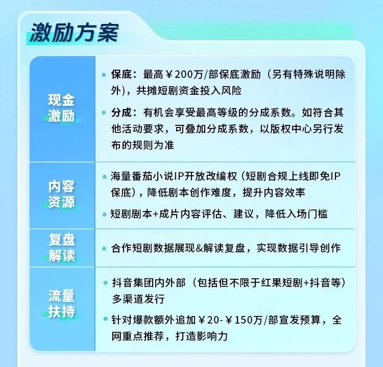 ④流量支持:抖音集团多渠道发行,爆款还可额外追加¥20-¥150万/部宣发预算。