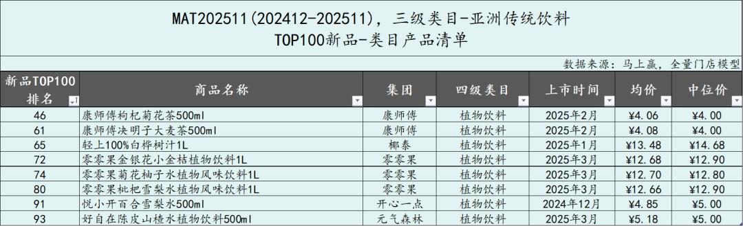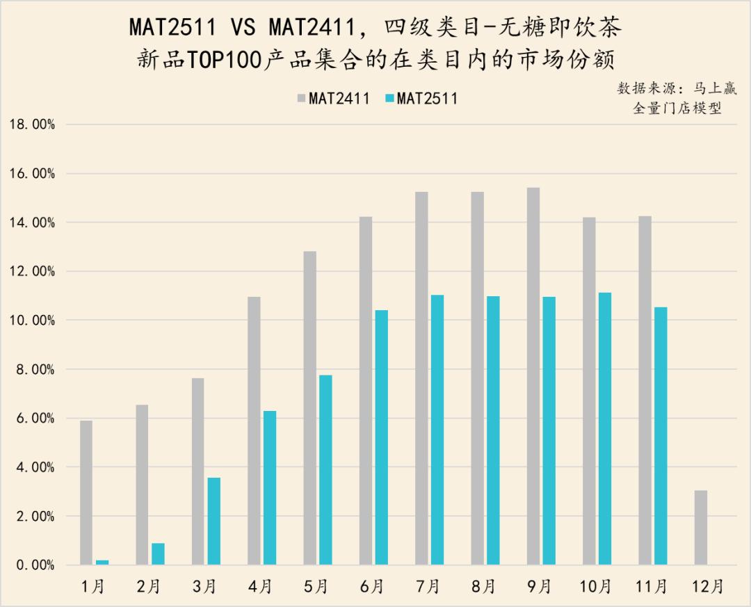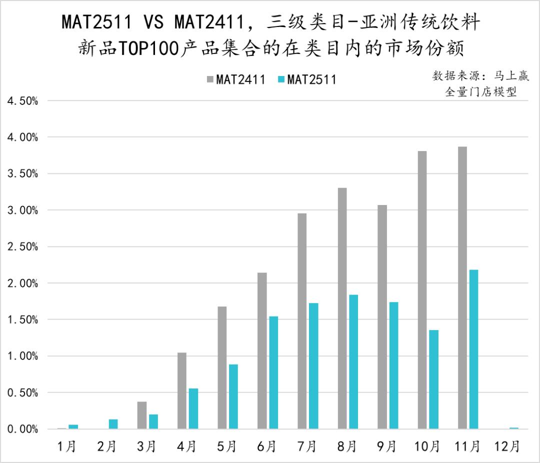 从亚洲传统饮料类目中,TOP100新品的市场表现来看,MAT2511的TOP新品集合的市场份额表现明显弱于MAT2411的TOP新品表现,除11月外其他月份均未超过2%。