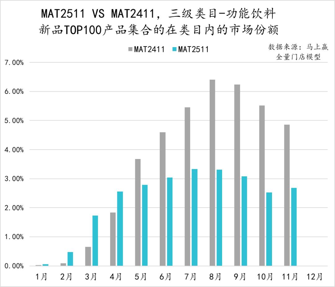 从功能饮料类目内TOP新品集合的各月市场份额来看,MAT2511相比MAT2411市场份额出现了一定程度的萎缩。但在2025年11月,MAT2511的TOP新品份额有一定的增长趋势。