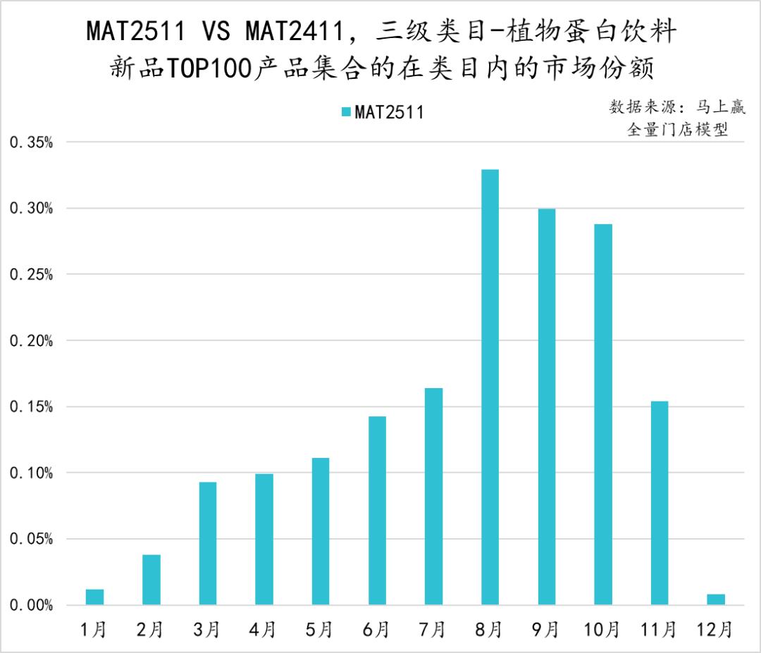 相比MAT2411,MAT2511植物蛋白饮料在TOP100新品中取得了0的突破。由于两款新品上市时间分别为2024年12月和2025年7月,因此在8月产品集合迎来了市场份额峰值,但整体市场份额依然较低不足0.35%,且在随后的9-11月呈现明显的下滑。