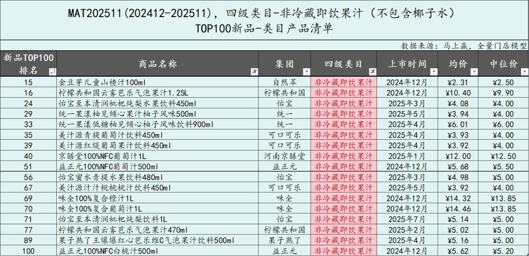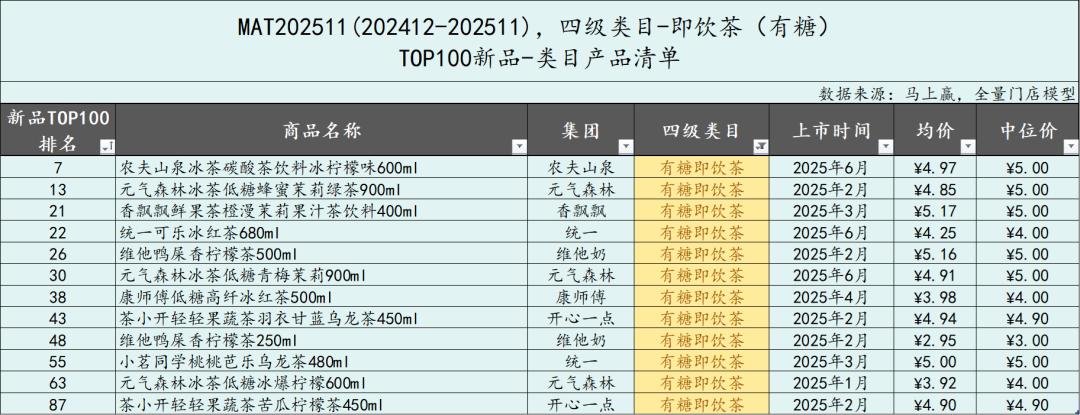 - 非冷藏即饮果汁、有糖即饮茶、植物饮料和即饮咖啡类目的TOP100上榜新品数量明显增加。非冷藏即饮果汁类目在MAT2511的TOP100上榜新品数量高达26款,比去年的13款高出一倍。有糖即饮茶的TOP100新品数量从7款跃升到12款,成为今年新品TOP100上榜数量TOP3的类目。植物饮料类目、即饮咖啡类目进入TOP100的新品数量均为8,但相比去年均有翻倍以上的数量增长。