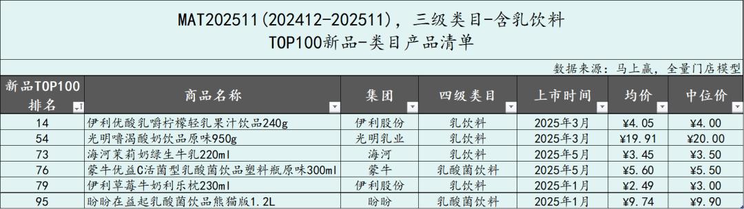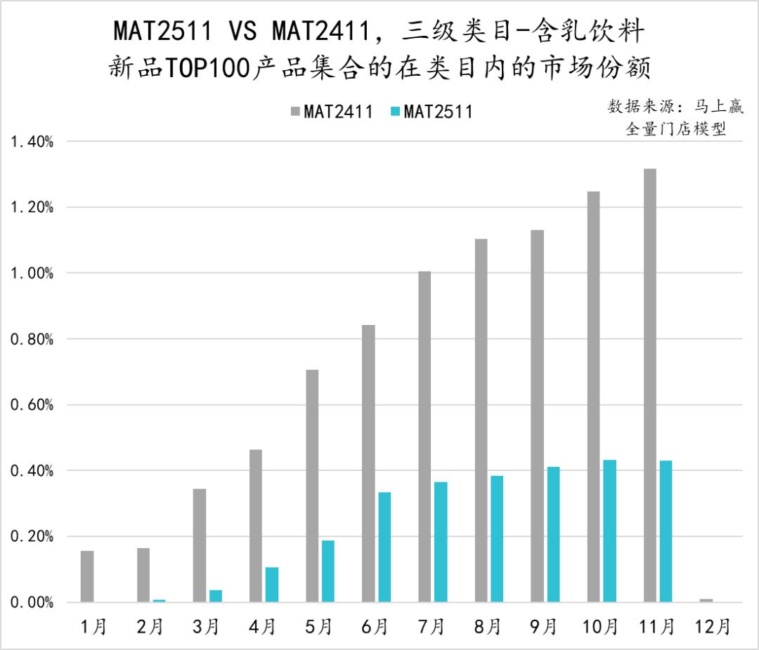 从含乳饮料类目中TOP100新品的市场表现来看,相比MAT2411,MAT2511时间段的新品在类目内的成长明显更差,在大多数月份,MAT2511的TOP100新品的市场份额不足MAT2411的三分之一,或可说明过去一年,类目新品表现、成长性相比之前更差。