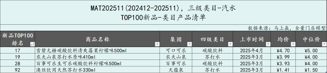 从汽水类目内TOP100新品集合的各月市场份额来看,MAT2511时间段内,TOP新品集合的市场份额始终未超过1%,且自2025年7月以来还有持续下滑。四款产品中两个碳酸饮料产品均为传统产品品牌的口味延伸,也可能是季节性限定口味,整体并未在传统的市场格局中掀起太多波澜。