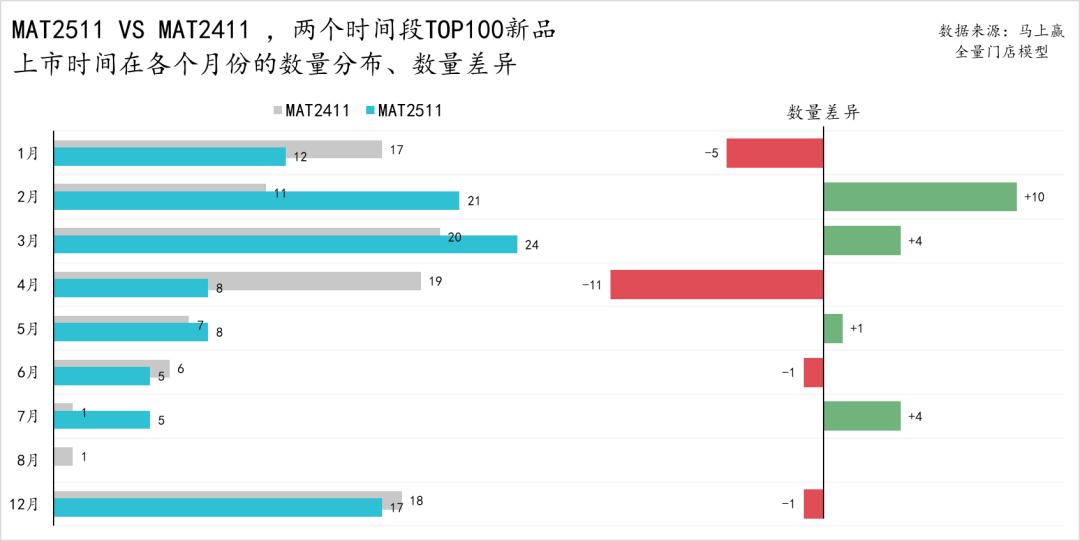 在TOP100新品分布与趋势变化的最后,我们也观察了TOP100新品在两个时间段中各自不同的上市时间分布情况。