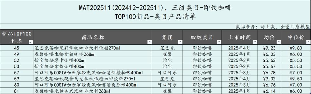 从即饮咖啡类目中,TOP100新品的市场表现来看,相比MAT2411,MAT2511的表现明显更好,新品集合自4月起市场份额就超过了MAT2411新品的表现。同时,类目中的TOP新品集合在2025年11月已经占据了5%左右的市场份额,新品成长性表现较好。