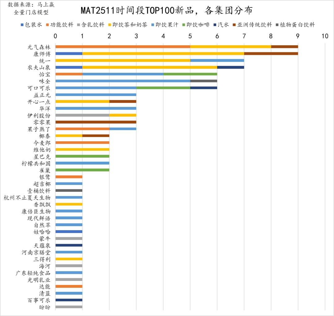 在MAT2511的饮料类目TOP100新品中,还有高达20个集团有1款新品上榜,其中既有老牌饮料集团,也有许多新鲜名字,值得进一步观察其未来表现。