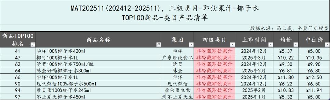 在即饮果汁类目中,椰子水类型产品也在今年的TOP新品中占据了相当大的比例,共有8款产品在MAT2511进入到TOP新品中。产品类型都是100%椰子水产品,来自7个不同的集团,规格245ml到1L均有覆盖。