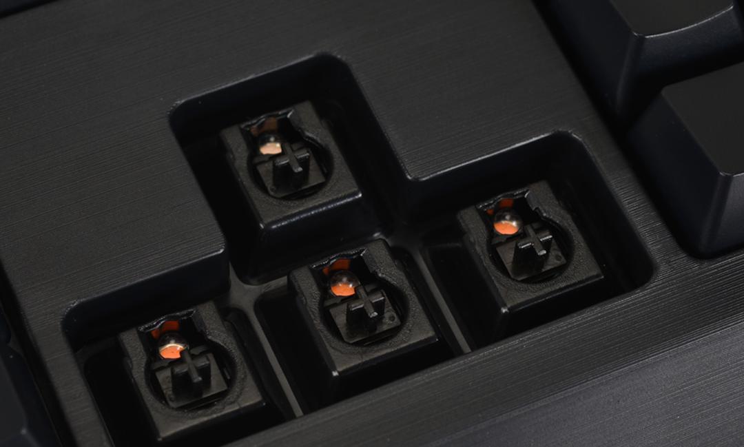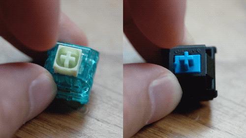 相比于整个集成的设计,MX 轴是一颗一颗独立的,有一颗坏掉了,可以脱焊再焊一颗新的上去。更关键的是,它采用了 Cherry 独有的 Gold Crosspoint ( 黄金触点技术 ),在触发精度跟使用寿命上达到了新的高度。