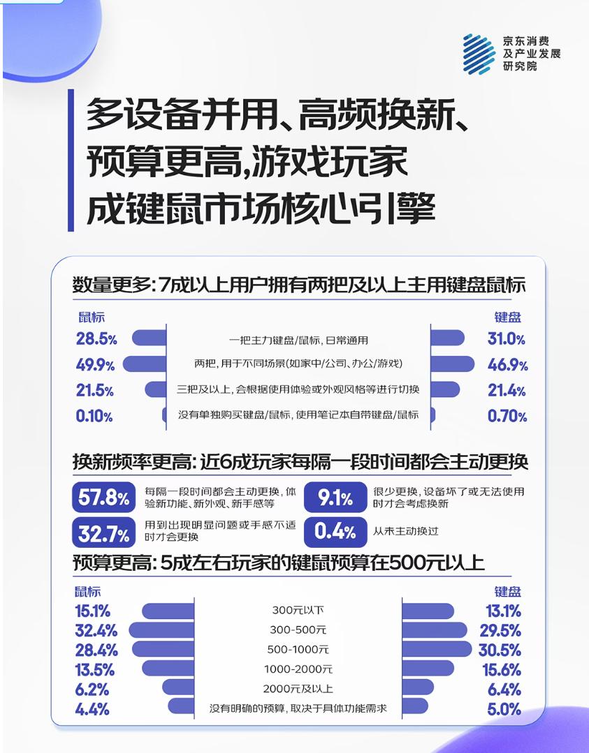 根据京东研究院数据,磁轴键盘(62.5%)、轻量化鼠标(60.1%)与光轴键盘(58.3%)为玩家票选的TOP3 “ 电竞外设 ” 代表品类,并加速向主流市场渗透;在深度游戏玩家中,磁轴、光轴键盘渗透率接近五成,并逐步延伸至非游戏用户群体。