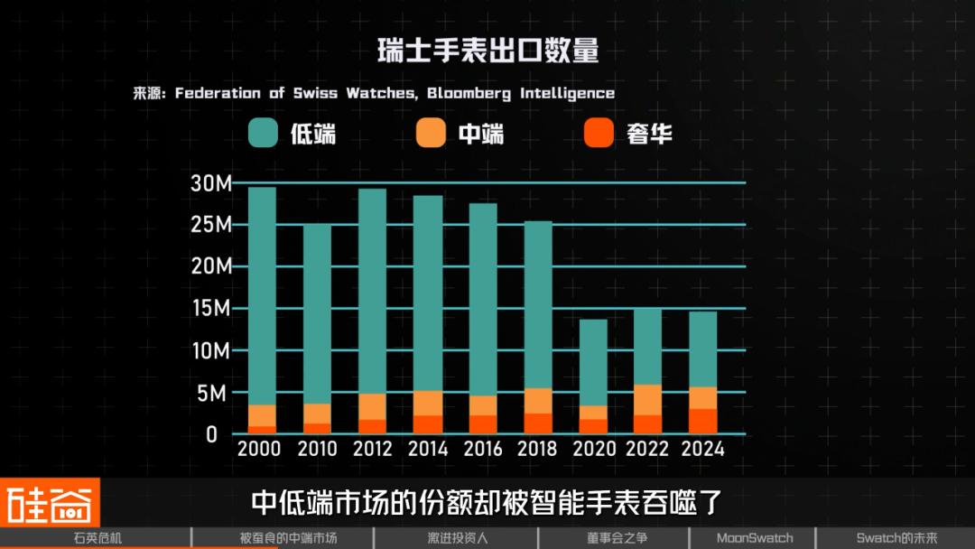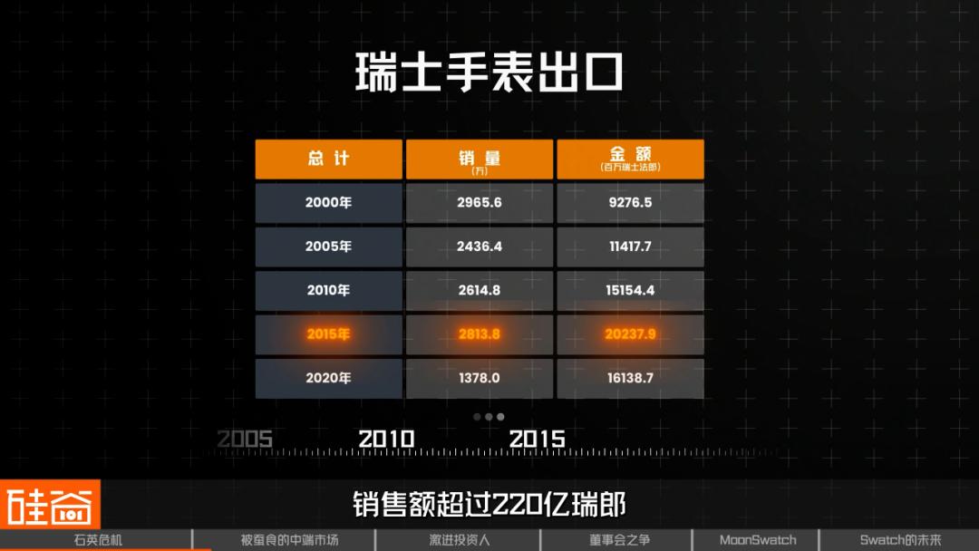 在Swatch的黄金年代,腕表是日常生活的标配。瑞士钟表的出口额从1990年代到2010年代持续增长。从数量上看,在2014年左右瑞士共出口将近2800万只腕表,销售额超过220亿瑞郎。