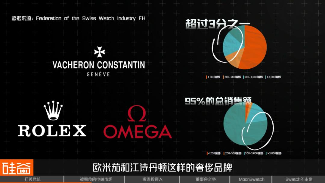 我们来看2015年之后瑞士腕表出口数据,就会发现这样一个现象:虽然出口数量没有之前高,但销售额却在不断攀升。这得益于高端和奢侈表市场的渗透:2023年,瑞士腕表出口再次达到历史新高,而其中,价格超过500瑞郎的腕表占据了三分之一的总销量和95%的总销售额。这就包括像劳力士、Omega和江诗丹顿这样的顶奢品牌。