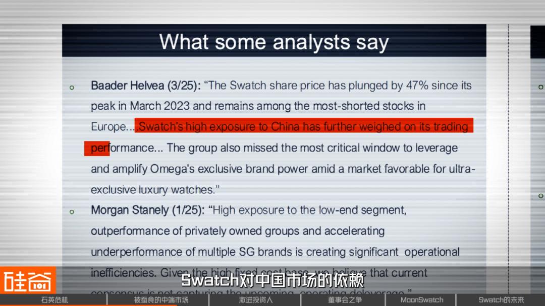 在财报中,Swatch集团将这一下滑完全归因于中国市场表现不佳。2024年全年,中国市场销售额环比下滑约30%。到了2025年,这一趋势仍在愈演愈烈:今年上半年,Swatch的批发业务下跌30%,零售业务也下滑15%。Baader Helvea的分析师提到:Swatch对中国市场的依赖严重影响了其股票表现。