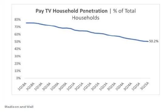 最近几年美国传统电视的收视每年下降8–12%。美国有线电视订阅用户从峰值的2010年约1亿户,下降到约5000万户,用户流失超过一半。传统电视商业模式进入“不可逆衰退”,被流媒体订阅+Connected TV程序化广告投放所系统性替代。