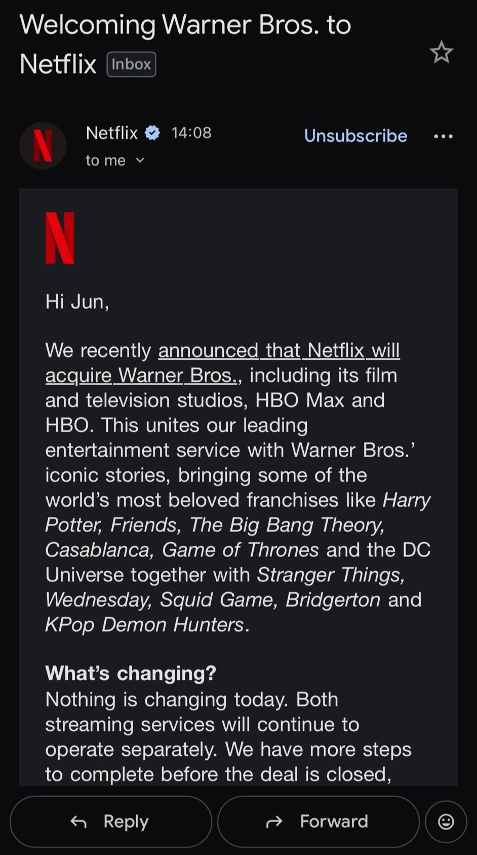 并购公布后不久,Netflix向用户发送了一封邮件。作为加拿大订户的我也收到了。Netflix表示用户会员资格不会发生任何变化。