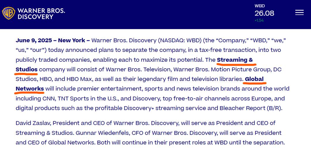 华纳兄弟业务拆分的本质是把衰退盘剥离,让好资产轻装上市/被收购;同时把债务留在TV盘,避免拖累IP&流媒体估值。