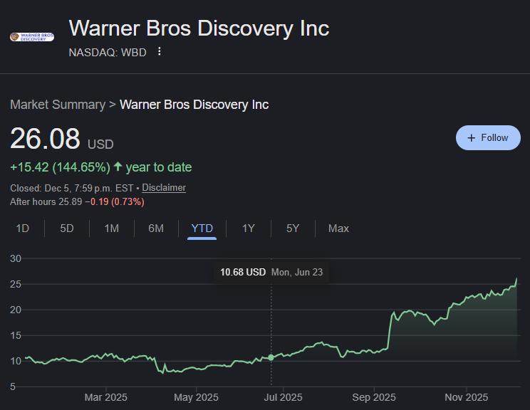 从宣布拆分到收购意向正式达成前的五个月里,华纳兄弟的股价已经上涨了超过100%,说明市场充分认可与传统电视剥离后的华纳IP和HBO组合的资产价值。