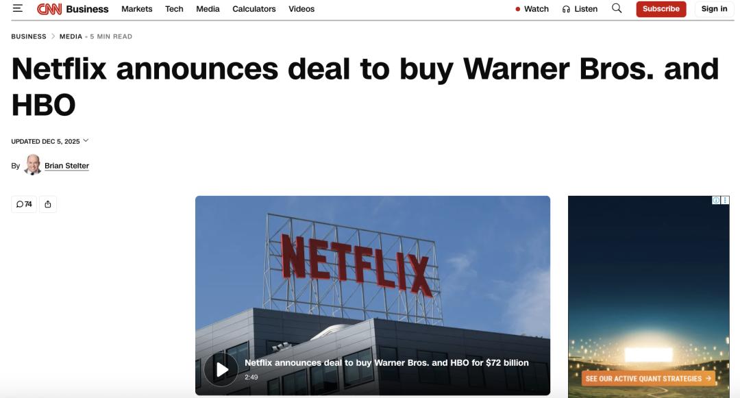 但Netflix对华纳兄弟的收购一旦成功,将是对整个影视产业权力格局的再次重置。好莱坞百年叙事第一次出现——不是传统制片厂吞并新兴平台,而是数字流媒体时代的霸主完成对旧时代巨头的接管。