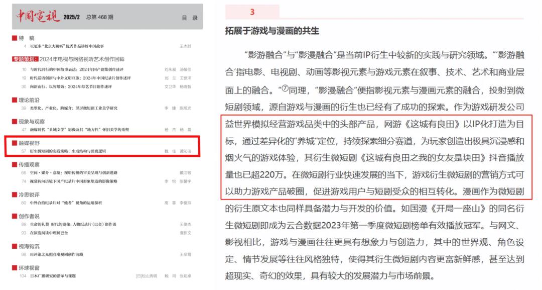 近年来,跨媒介叙事成为激活IP生命力的创新策略之一,除动画短片、电影、电视剧外,当下正火的短剧也成为游戏传播的主要媒介。腾讯旗下「王者荣耀」、网易旗下「逆水寒」以及益世界旗下「这城有良田」等游戏都曾推出过短剧。今年,益世界「这城有良田」同名短剧——《这城有良田之我的女友是块田》作为“游戏+短剧”融合创新案例被权威期刊《中国电视》纳入研究。