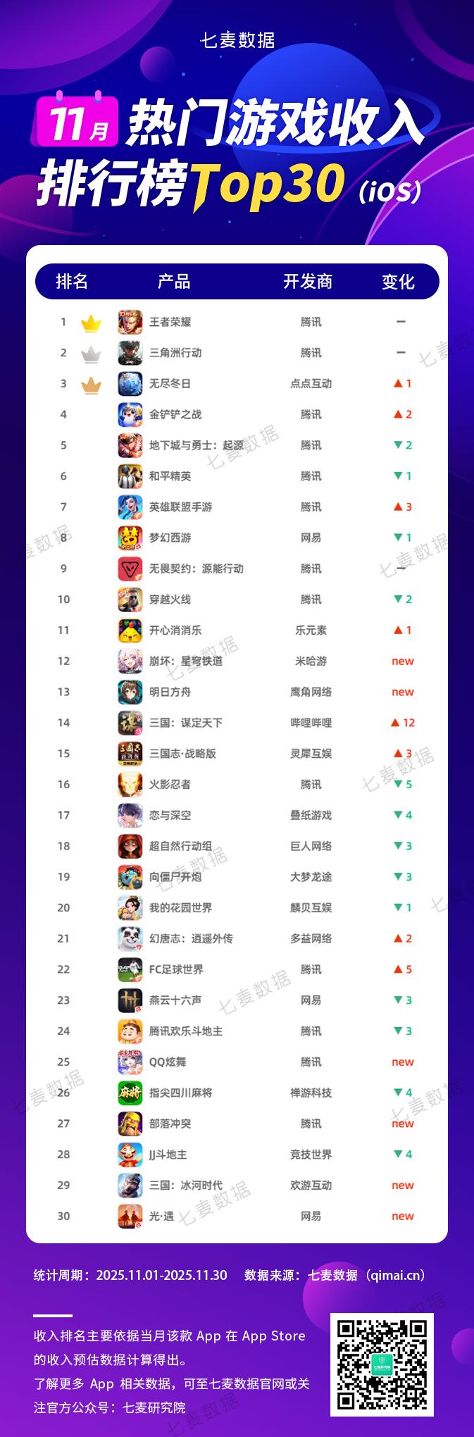 近日,七麦数据发布了2025年11月热门游戏排行榜,其中包括热门游戏下载榜Top30和热门游戏收入榜Top30。11月手游市场百花齐放,经典IP改编新游一经上线便获得市场热度,老牌产品靠优质内容驱动实现了新一轮爆发……接下来让我们一起来看看吧!