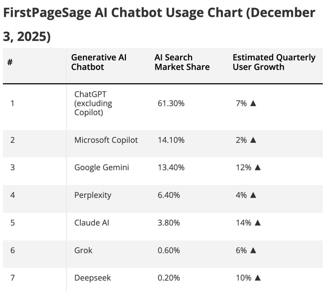 本月初,SEO和分析公司FirstPageSage发布了最新AI市场份额报告。