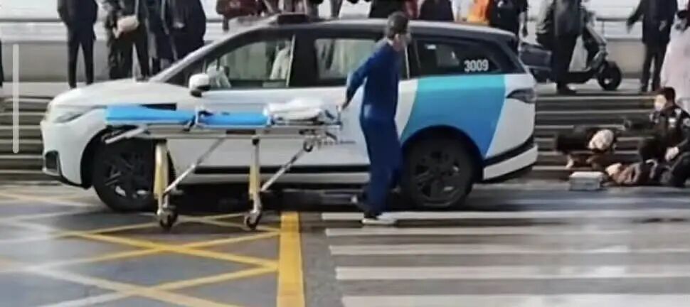 据现场目击者描述,事故发生时,两名行人正在斑马线处正常过马路,涉事Robotaxi未采取避让措施,直接撞倒行人,其中一人被卷入车底。