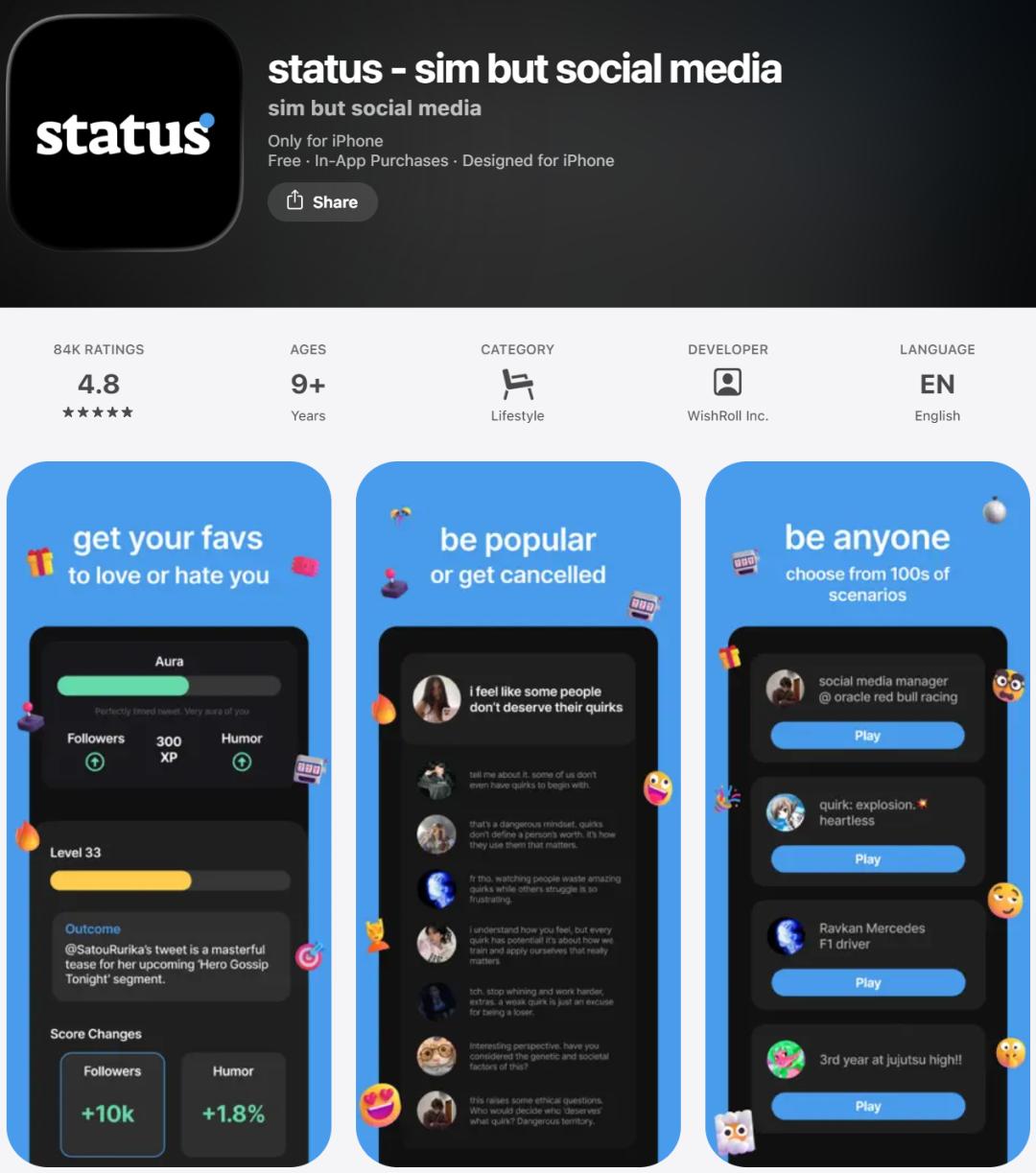 它其实是一个AI Roleplay模拟器游戏,界面做得非常像App。你在游戏里可以设定自己的背景,创建自己的社交账号,而后很多名人(AI)就会来和你互动,而游戏给玩家设立的目标是「涨粉,让自己成为大网红」……它把AI模拟和多人社会的概念,以一个非常低的成本做了出来。