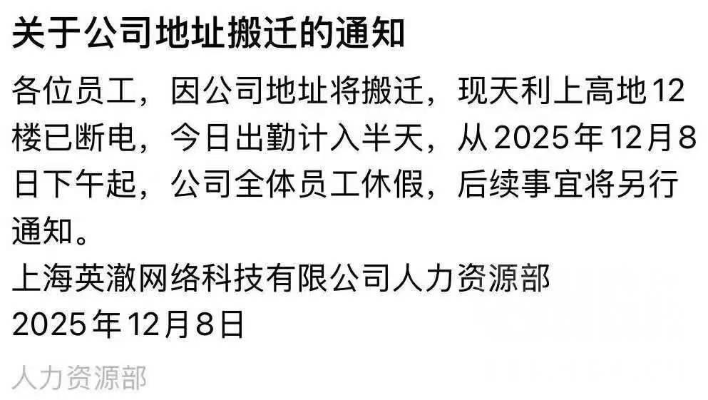 前天,互联网上流出了一张英澈内部通知的图片,其内容称:公司的地址将搬迁,原办公室已停电,从昨日下午起,公司全体员工休假,后续事宜待进一步通知。