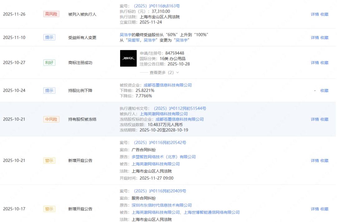 其它方面,英澈也不算太平,10月份时,英澈新增了两则开庭公告,其内容涉及服务合同纠纷以及广告合同纠纷,后续,英澈投资成都苍墨所持有的股权被冻结,成都苍墨则是单机游戏《代号:锦衣卫》的开发商。