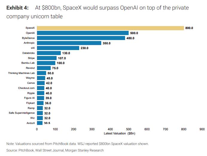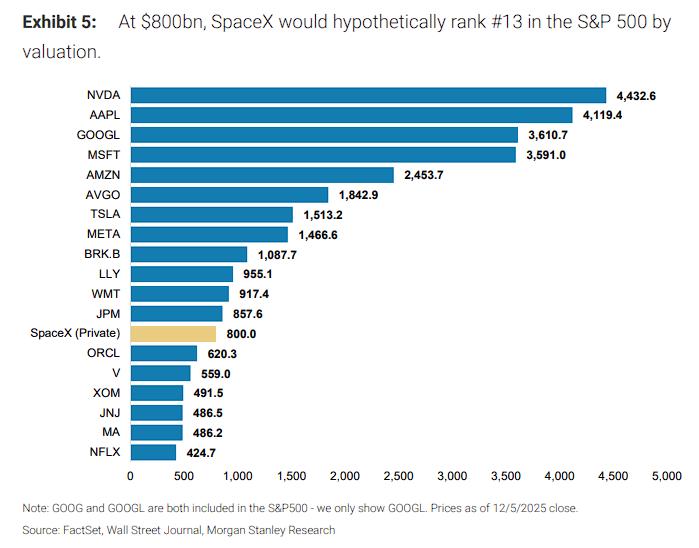 大摩称,如果将SpaceX置于标普500指数中,8000亿美元的市值将使其排在第13位,介于摩根大通和甲骨文之间。