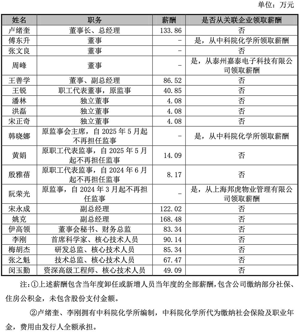 2024年度,中科科化董事、取消监事会前在任监事、高级管理人员及核心技术人员从发行人或发行人关联企业领取收入的情况如下: