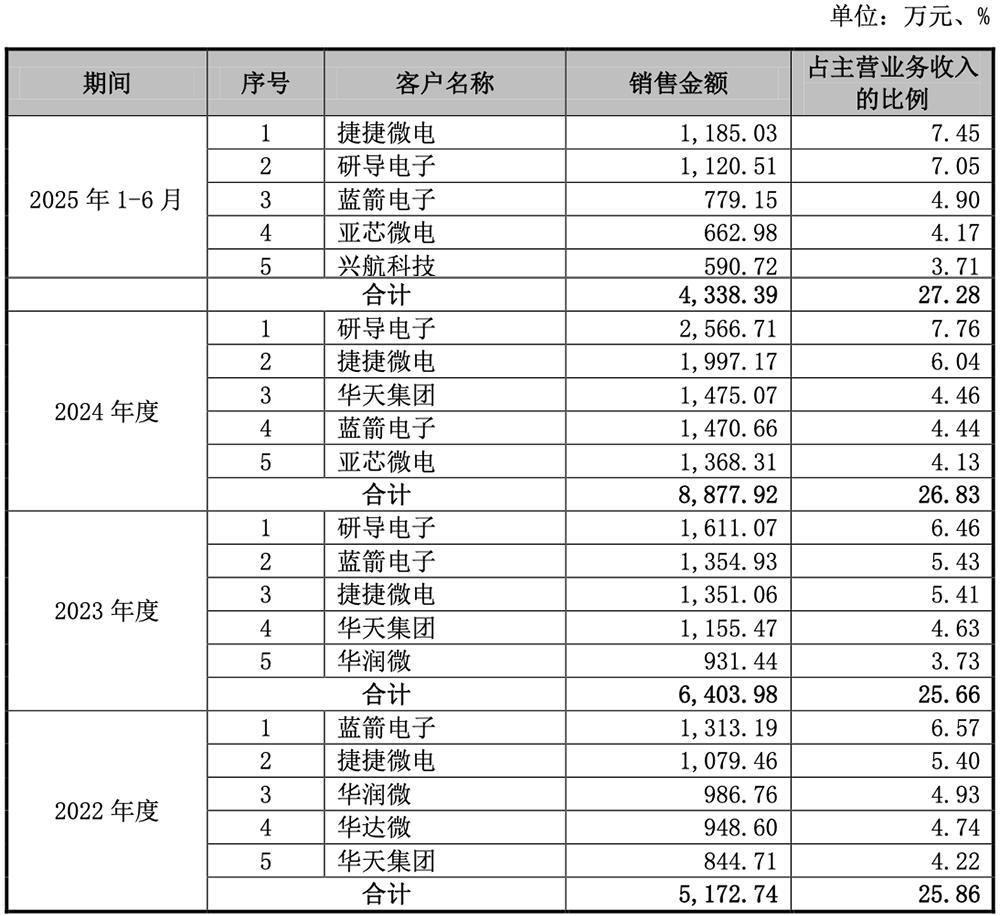 报告期内,其前五大客户销售金额占同期主营业务收入的比例分别为25.86%、25.66%、26.83%、27.28%,不存在对单一客户销售金额占比超过50%的情况,亦不存在严重依赖个别客户的情况。