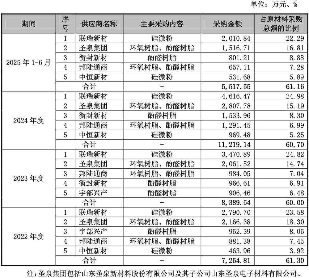 同期,中科科化向前五名原材料供应商合计采购金额占当期原材料采购总额的比例分别为61.30%、60.00%、60.70%、61.16%,供应商集中度相对较高。