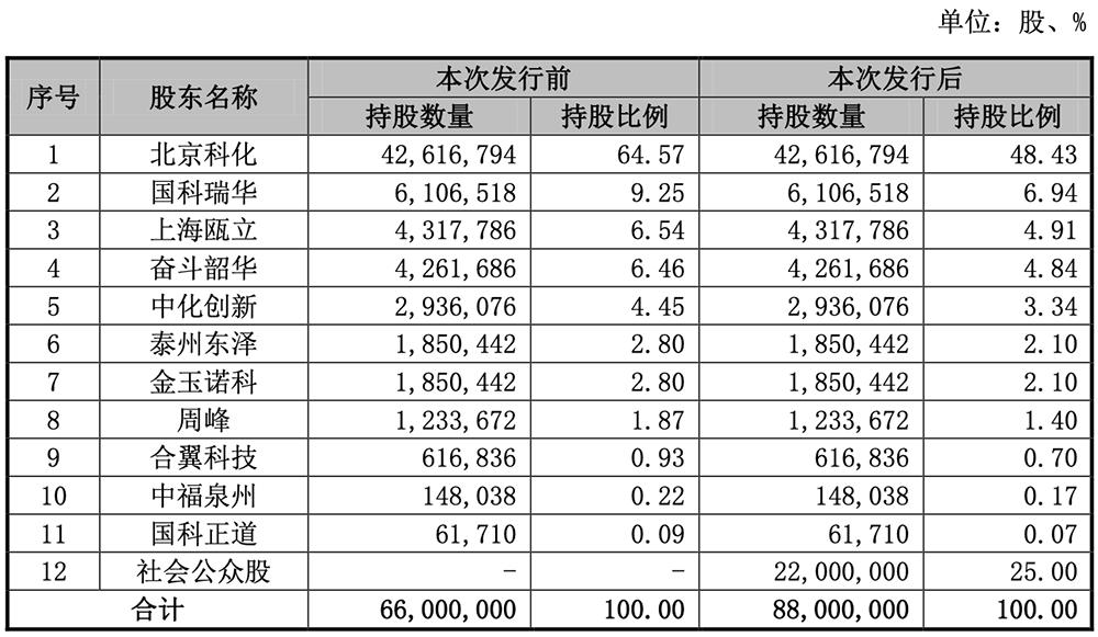 假设本次公开发行股票数量为2200万股,本次发行前后中科科化股本结构如下: