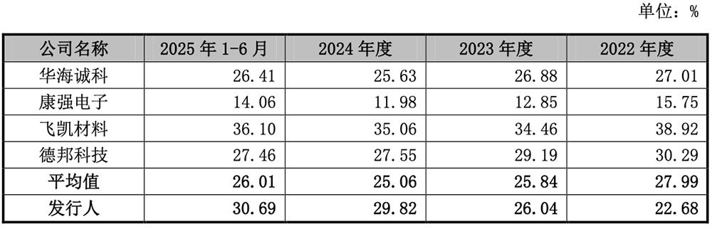 报告期内,该公司综合毛利率分别为22.68%、26.04%、29.82%、30.69%,呈逐年上升趋势,与同行业可比上市公司的综合毛利率对比情况如下: