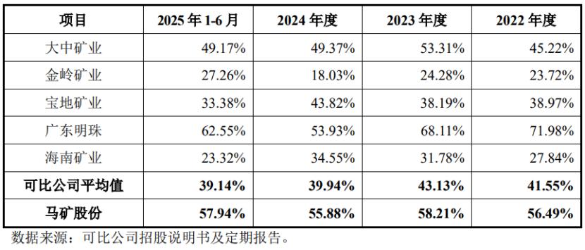 报告期内,马矿股份的主营业务毛利率分别为56.49%、58.21%、55.88%和57.94%,存在一定波动,公司主营业务毛利率高于同行业可比公司平均水平,主要系公司产品较为单一,与同行业可比公司业务模式、产品结构存在一定差异导致。