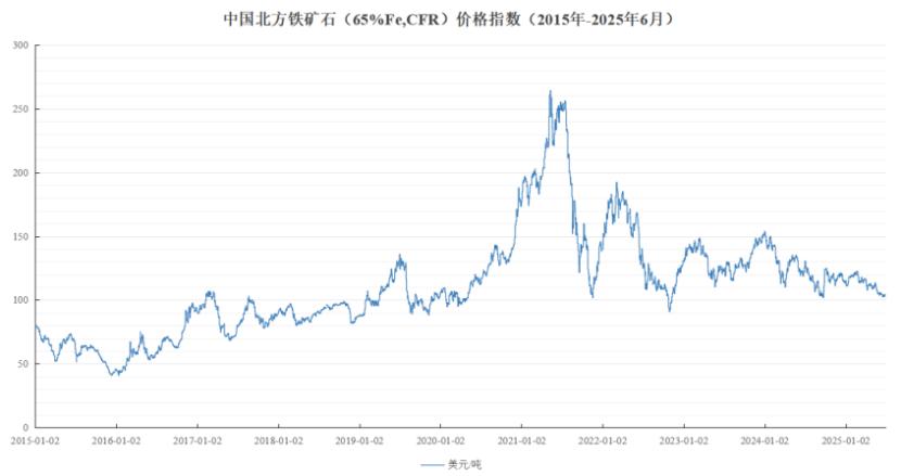 受宏观经济、铁矿石供需关系、海运价格等影响,近年来铁矿石价格波动较大。2016年左右全球铁矿石价格处于近十年低点,随着全球经济复苏,尤其是发展中国家房地产与基础设施建设投入的加大,钢铁行业景气度回升,铁矿石价格在2021年中达到历史高峰,而后价格回落。