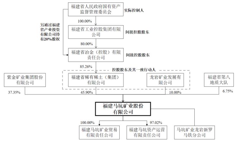 本次发行前,福建省国资委通过福建工控、福建冶控和福建稀土间接控制马矿股份55.9%的表决权,为实际控制人;紫金矿业持有公司37.35%股份,福建省第八地质大队也是公司股东。