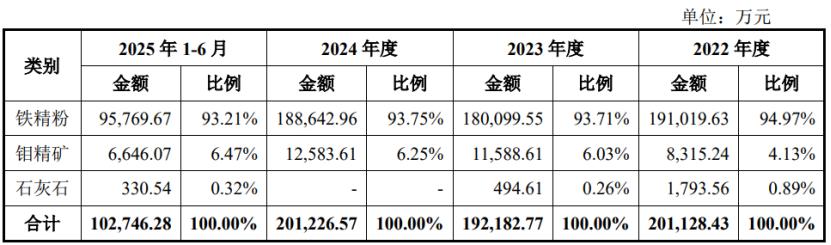 马矿股份主要产品为 TFe 65%的造球铁精粉和Mo 40%的钼精矿。2022年至2025年上半年(简称“报告期”),铁精粉产品为公司贡献了93%以上的营收,钼精矿的营收占比从4.13%提升至6.47%,石灰石的营收占比很低。